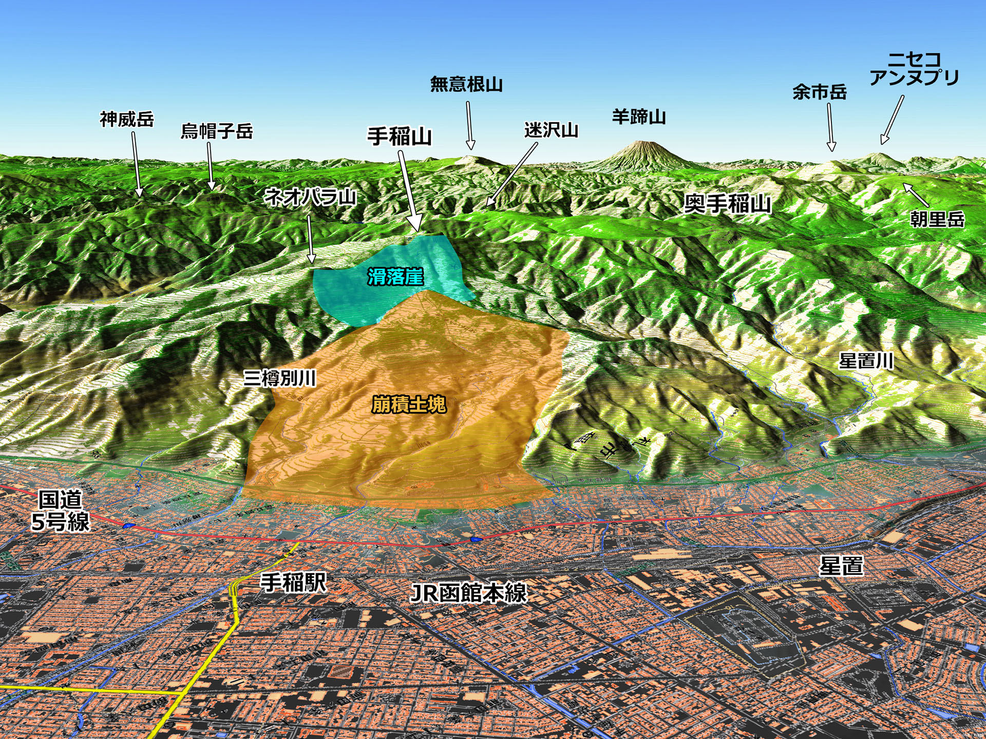 手稲山の東麓には,最大幅 4.5 km の巨大な地すべり地形があります.地すべりの発生時期は分かっていませんが,支笏火山の噴出以前で少なくとも5万年前より古いものです(宮坂ほか,2007).
