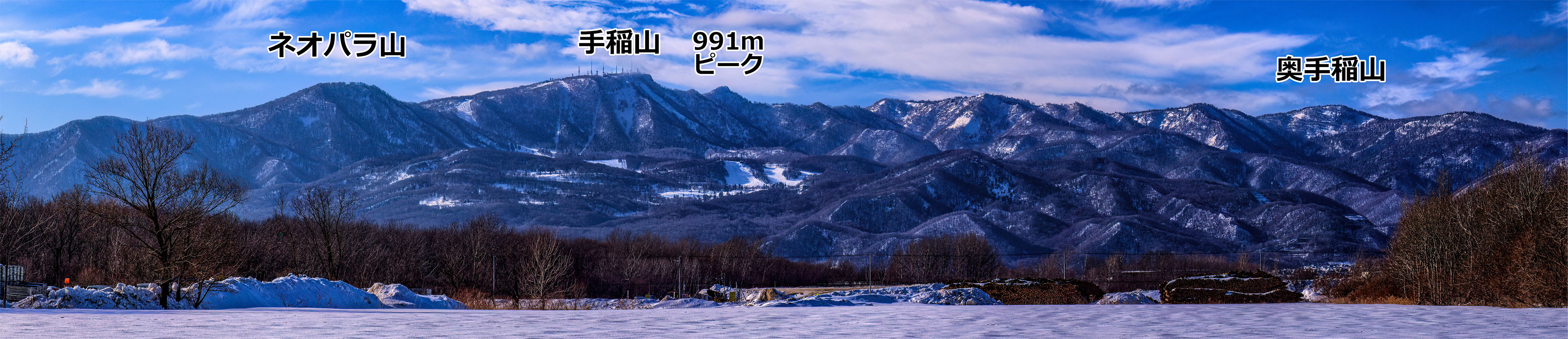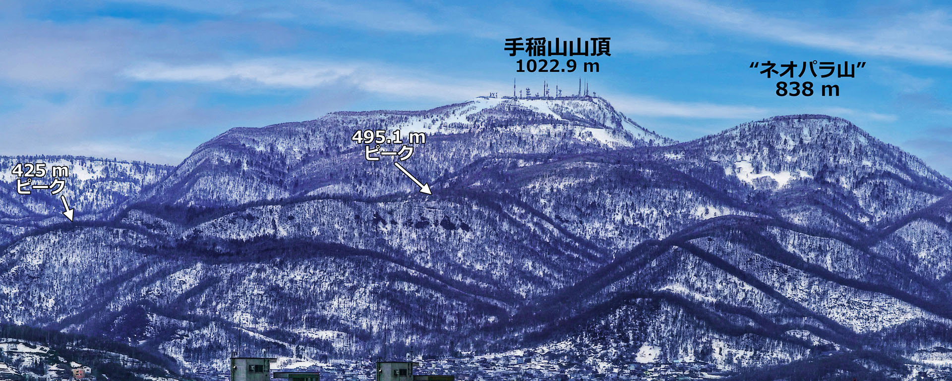 札幌市 手稲区新発寒付近 から見た手稲山と地すべり地形.焦点距離 120 mm で撮影したもの7枚を合成.2025/01 撮影.説明は下図参照.マウスホイールで拡大・縮小表示する.
