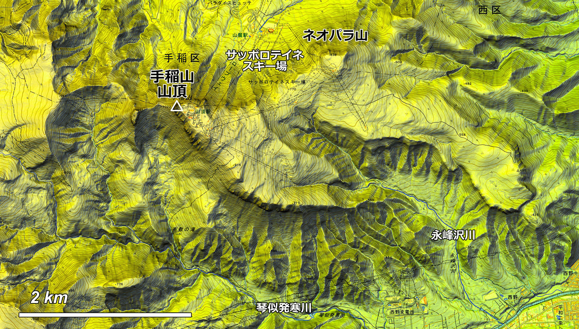 ※ 誤解のないように断っておくと,これは現在の藻岩山にこのような平面的な平坦面があるという意味ではありません.下に示す地形陰影図を見ると分かりますが,単に稜線の頂部が横から見ると凹凸のない直線状になっているということです.これはおそらく,元々あった平坦面が浸食・開析された結果ということでしょう.