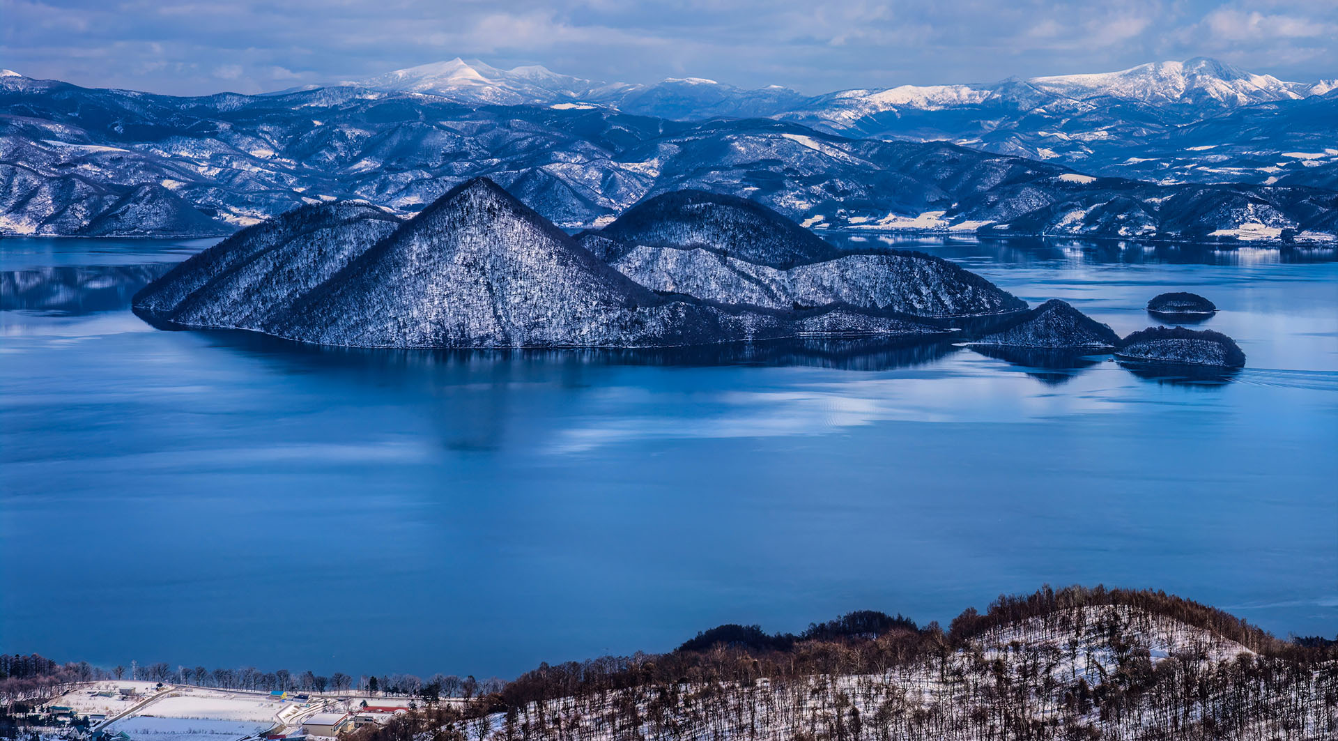 『支笏カルデラ』は,数万年前に破局的噴火を起こした支笏火山の頂部が陥没したもので,そこに雨水が溜まって支笏湖となりました(右写真).