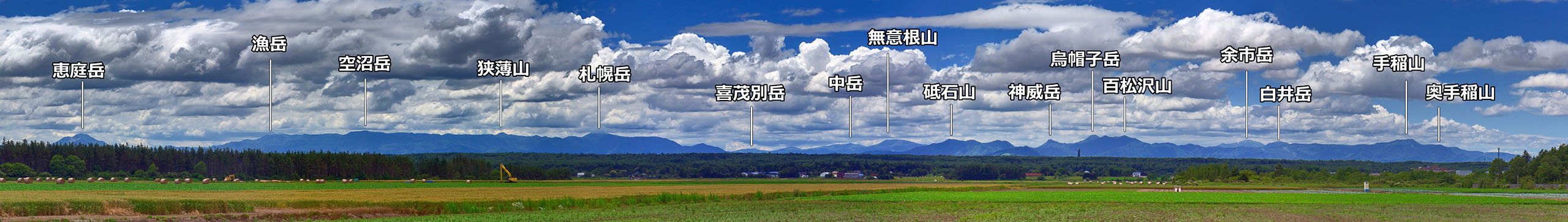 下の長大なパノラマ写真(11枚合成!)は,もともと芦別岳~夕張岳をターゲットとして撮影したものですが,その右手前に夕張山地があり,さらに右側はるかに日高山脈が見えています.撮影地点は恵庭市恵庭墓園です.これを撮った時は,日高山脈が見えているな~...と思っただけで,その後まじめに追究することもなく忘れていました.クリックで拡大表示を示しますが,これで見ると,驚くというか意外なほど日高山脈の山並みがぞろぞろと見えています.