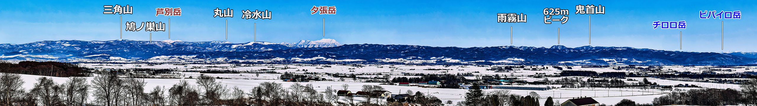 札幌市南区硬石山南から見た藤野三山.豊平川段丘面の手前を豊平川が流れている.焦点距離 60 mm で撮影した3枚をパノラマ合成.2026/01 撮影.電線と電波塔を Photoshop の Generative Removal 機能で除去している.