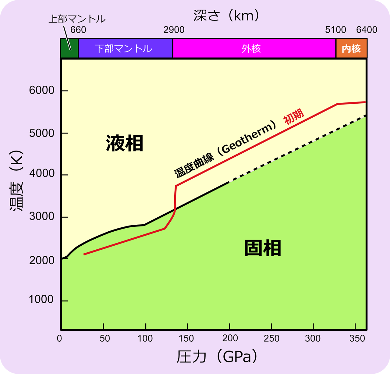 鉄の温度-圧力による簡略化した状態図と地球内部構造.広瀬(2012)のスライド を参考に作成.温度曲線変化は独自に加えたもの.初期状態が表示されていて,マウスオーバーで現在の状態を表示する.