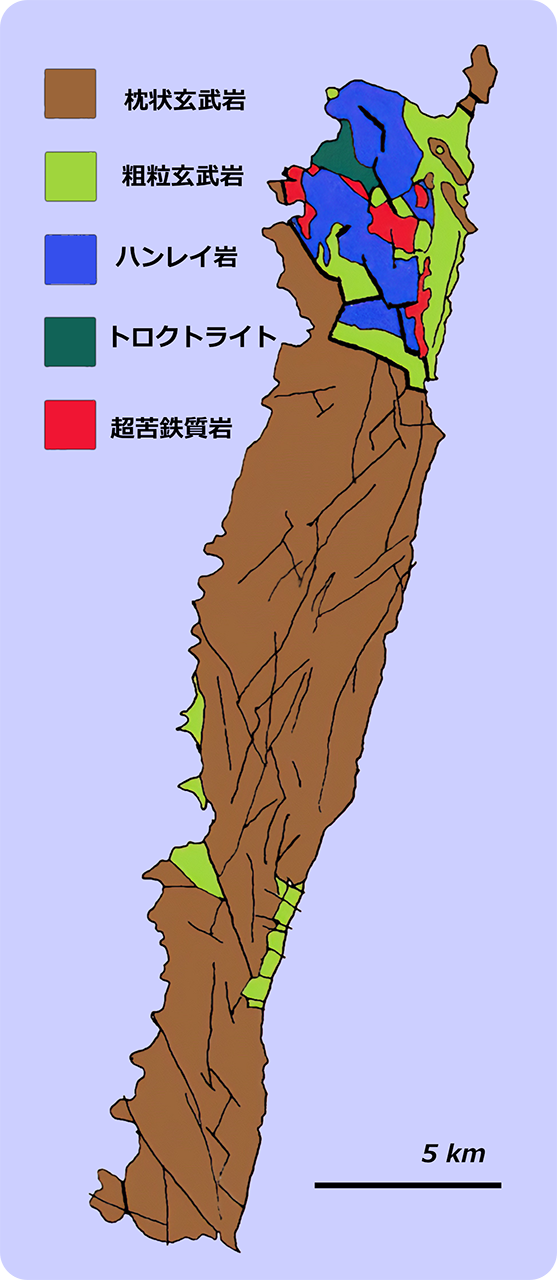 島の形状は東岸部がより直線的で,一方で西岸部が入り組んでいることから,断層系の一部が東岸部付近を通過しており,島全体が西へ緩く傾動している可能性が考えられます.広く分布する枕状溶岩は水平に近い緩傾斜分布をしているものと思われます.