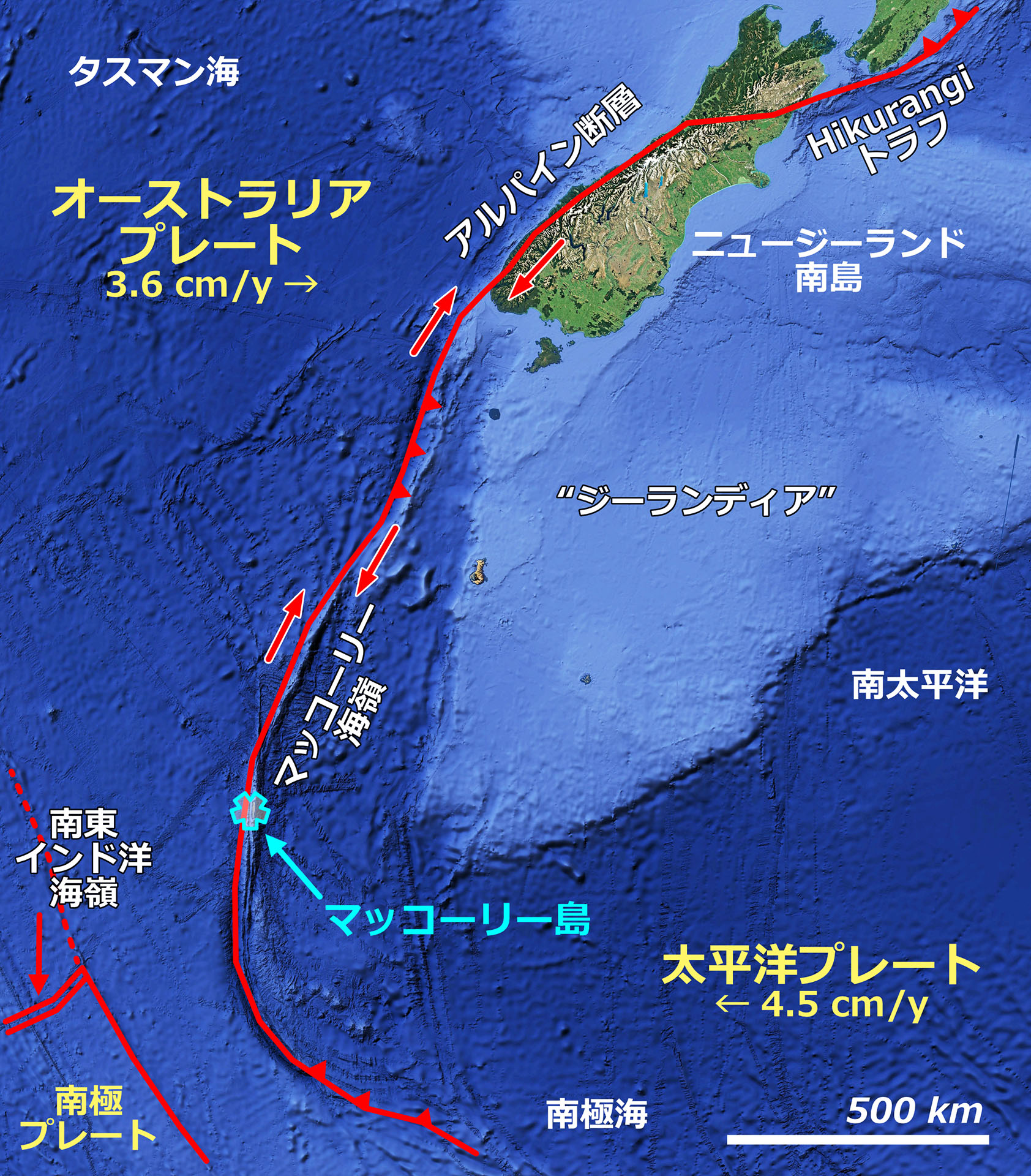 オーストラリア・プレートは東北東へ年間 3.6 cm,太平洋プレートはほぼ西へ年間 4.5 cm の速度で移動しており,マッコーリー海嶺は両者の衝突・横ずれ帯となっています.