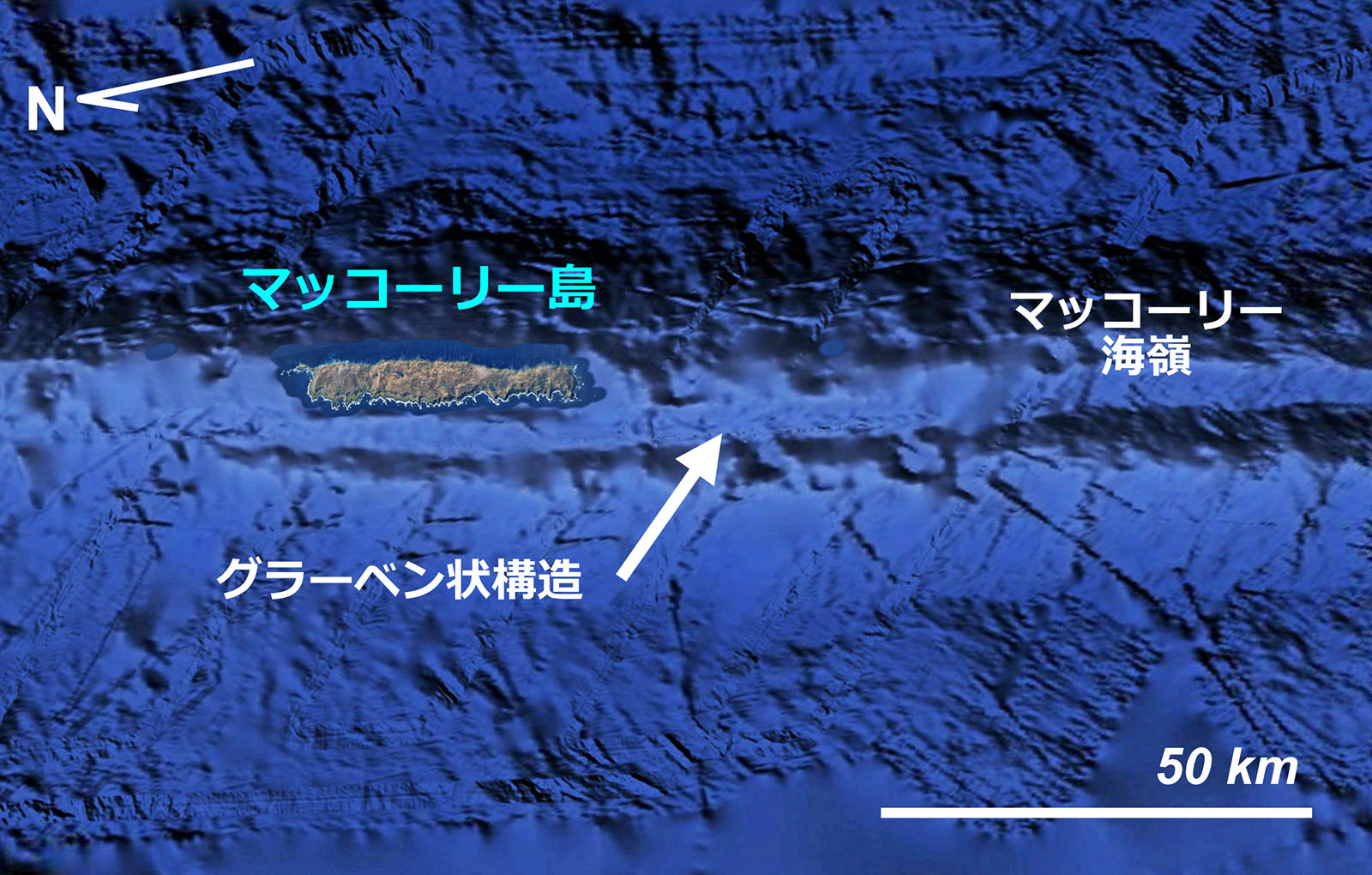 マッコーリー海嶺.左下方が北であることに注意.海底地形図は Google Earth による.