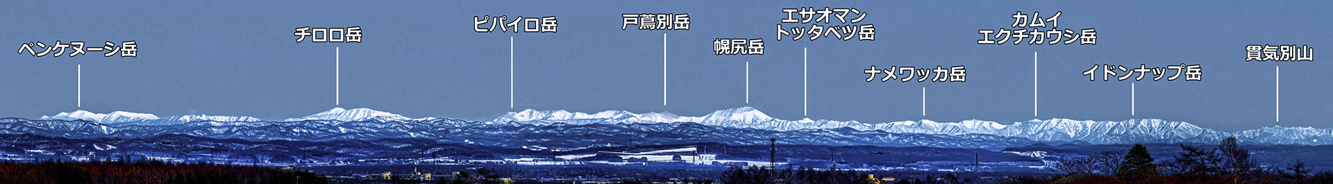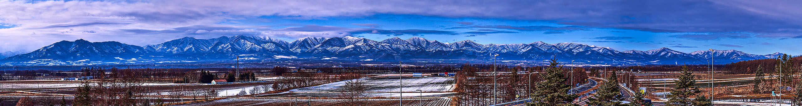 厳寒の安平低地と夕張山地.右背後に見えるのは夕張岳.その左がマウント・レースイ,さらに左に芦別岳が頭を覗かせている.盆地・山地形成やナップ構造など,北海道中央部のプレート衝突に伴う東西短縮テクトニクスが地形として表現されている.参考画像ボタンで9枚の写真から合成された本来のパノラマの高解像度版(横7680ピクセル)が参照できる.由仁町馬追丘陵中腹より.