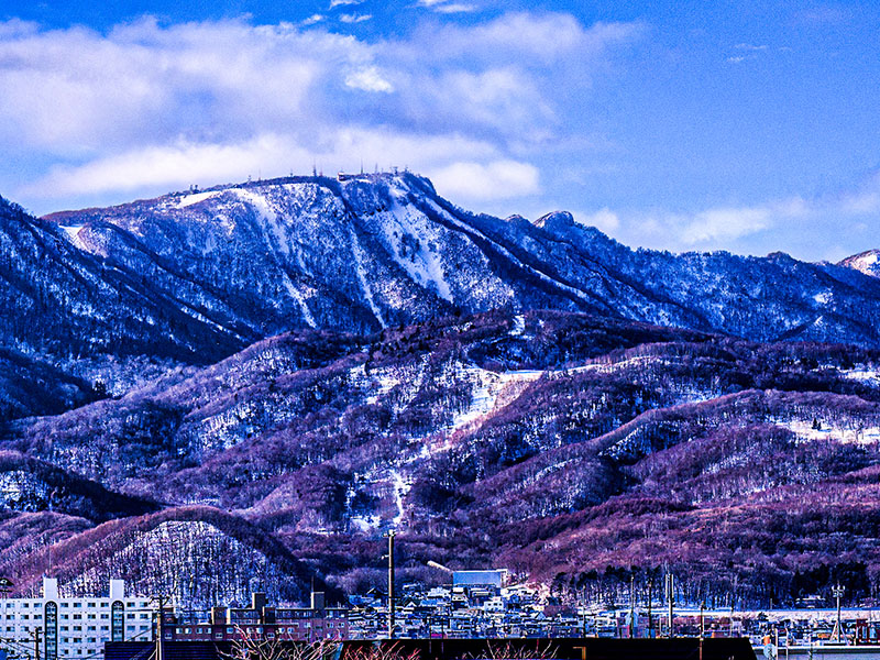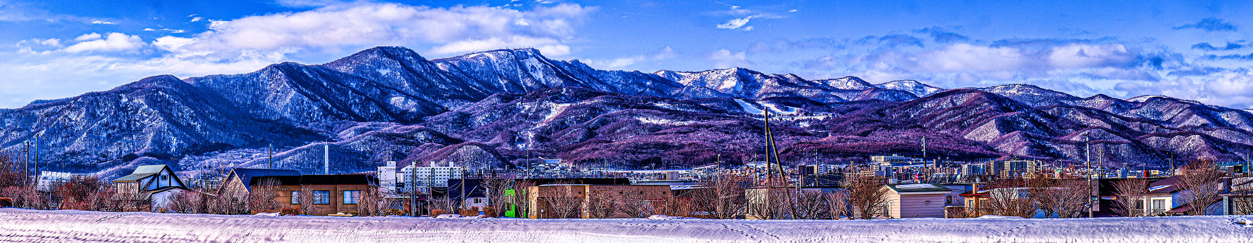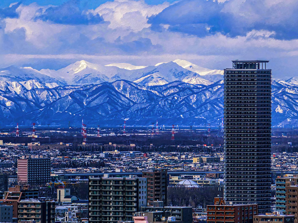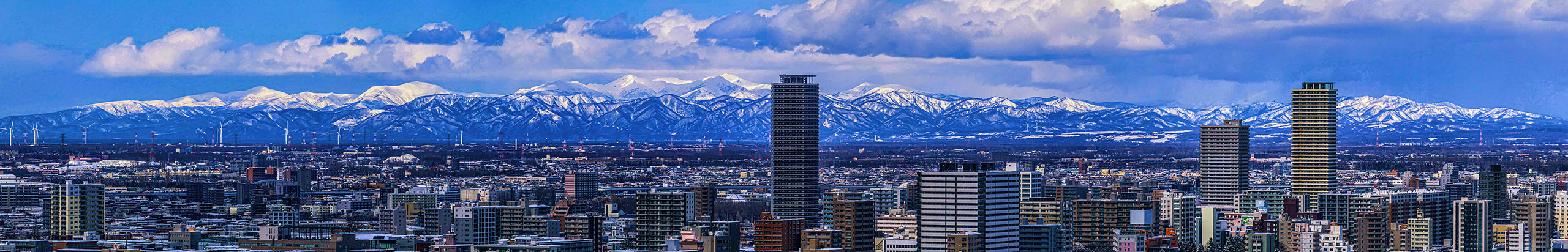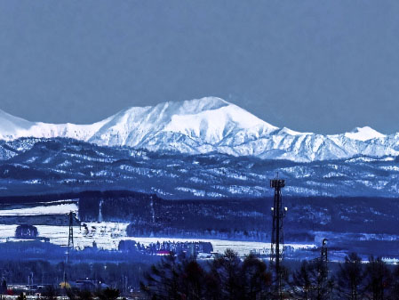 札幌市街地西縁部の住宅街・宮の森から東を見ると,近代的なビル街の向こうに増毛-暑寒別の山並みが広がっており,奇妙なミスマッチ風景を見ることができる.特に積雪期にはそのコントラストが美しい.写真中央の高層ビルの左背後に見えるのが暑寒別岳,その左が群別岳である.さらに左には,ボリュームのある浜益岳が見える.条件が良ければこの右側に芦別-夕張岳も見ることができる.札幌市宮の森.