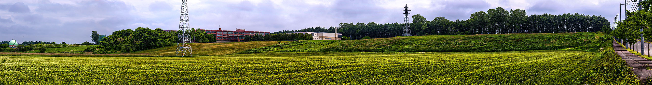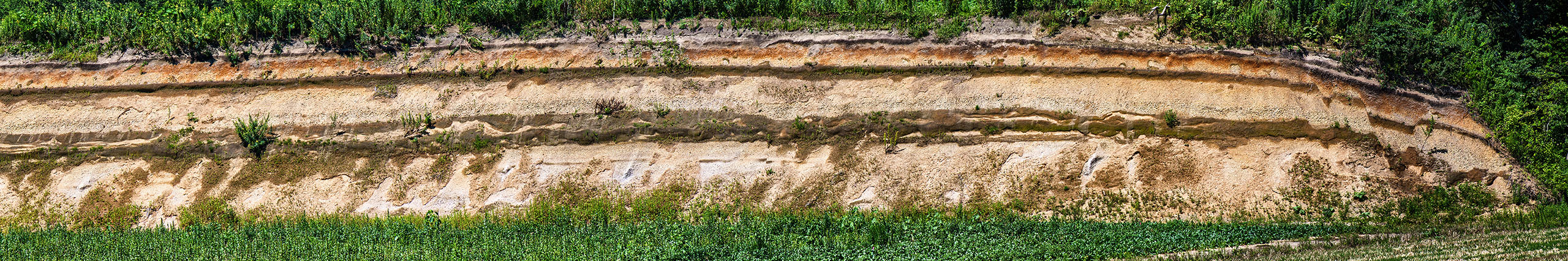 一見普通の露頭写真であるが,10 枚の露頭写真を合成した超ワイドパノラマ写真を掲載用に横方向 1/2 程度に縮小したものである.参考画像ボタンで本来のパノラマ写真(横7680ピクセル)を参照できる.地層は新第三系黒松内層の成層シルト岩.写真右端(層位的下位)には硬質頁岩層が露出しており,黒松内層とその下位の八雲層との整合関係を示していると考えられる.今金町住吉橋・後志利別川河畔.