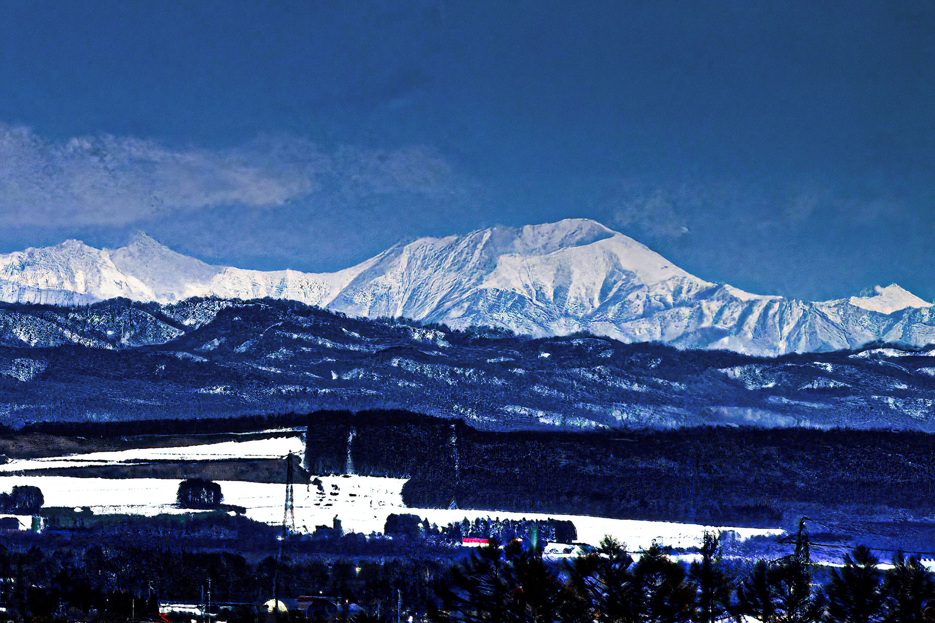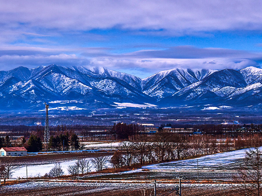 初冬(10月下旬)の冠雪した日高山脈の峰々が神々しい.稜線の形状がいかにも衝突山脈らしく,ヒマラヤ・アルプス的である.それぞれのピークの名前は残念ながら私は知らない.新ひだか町社万部山付近より.