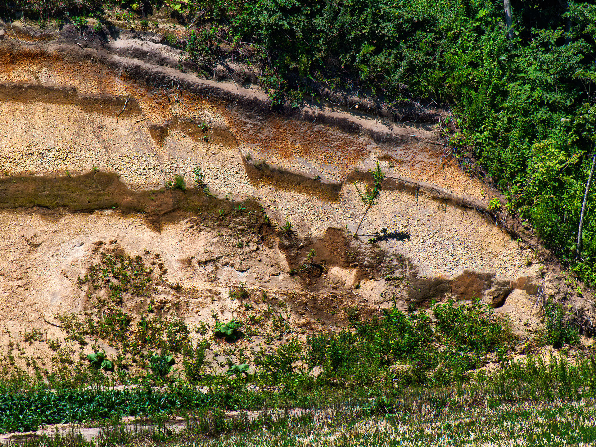 夕張周辺の挟炭層の標式的な露出として有名な場所である.元は露天掘りが行われたところらしく,夕張市の体験ツァーでも使われた場所と思われるが,おそらく現在は立ち入り禁止となっている.2008年5月撮影.露頭下部に黒い挟みが見えるがこれが始新統夕張層の薄い石炭層である.その下位が細粒相を主体とする蛇行河川成層,上位が礫岩を含む成層粗粒相からなる網状河川成層となっている.露頭上部の褐色に風化した部分は,浅海細粒相の若鍋(わっかなべ)層であるが,両層の境界は漸移である.夕張市三角山.