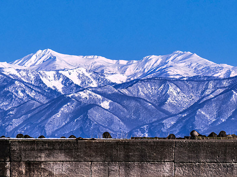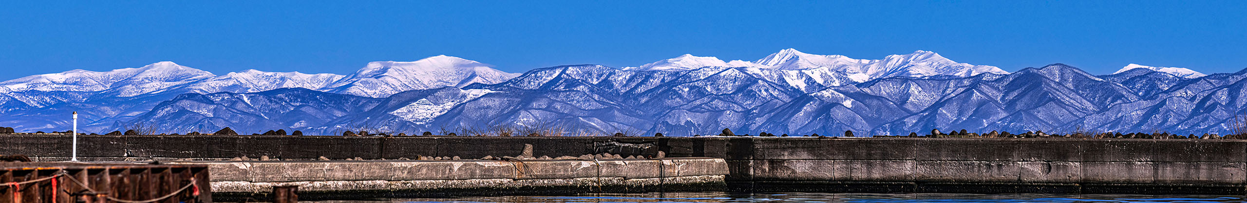 暑寒別岳は留萌南方に位置する大規模な第四紀火山で,本州火山弧の北端でもある.60 km 以上離れた札幌周辺からも見え,特に冬期は積雪の白さによってその神々しい山容が際立つ.写真中央右のもっとも高く見えるピークが増毛山地の最高峰・群別岳(1376 m)で,その右に見えるのが暑寒別岳である.右端にわずか見える白い部分が南暑寒別岳.写真中央左の大きなピークは浜益岳.石狩湾新港から.