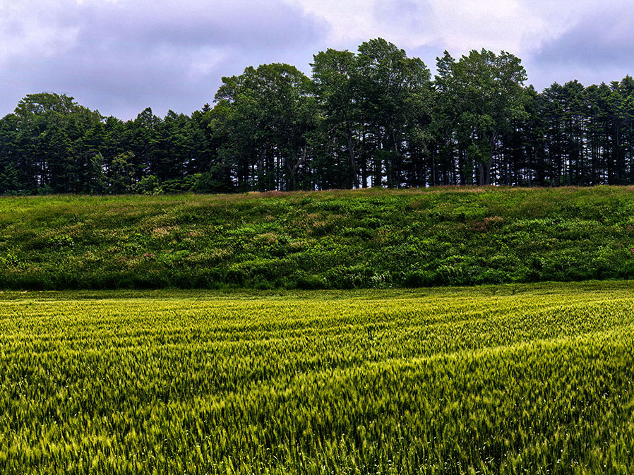 国内ではおそらく唯一のものと思われる大規模な泥火山(mud volcano)地形.右側に見える牧舎の左奥と背後の山林部の左前に見えている二つの牧草地の高まりが平頂泥火山体である.褶曲軸と断層に制御された地層水の高間隙水圧部が噴出泥の原因である.現在でも大きな地震が起こると噴泥が起きており,最近では 2008 年十勝沖地震の際に噴泥が観察されている.新冠町高江.
